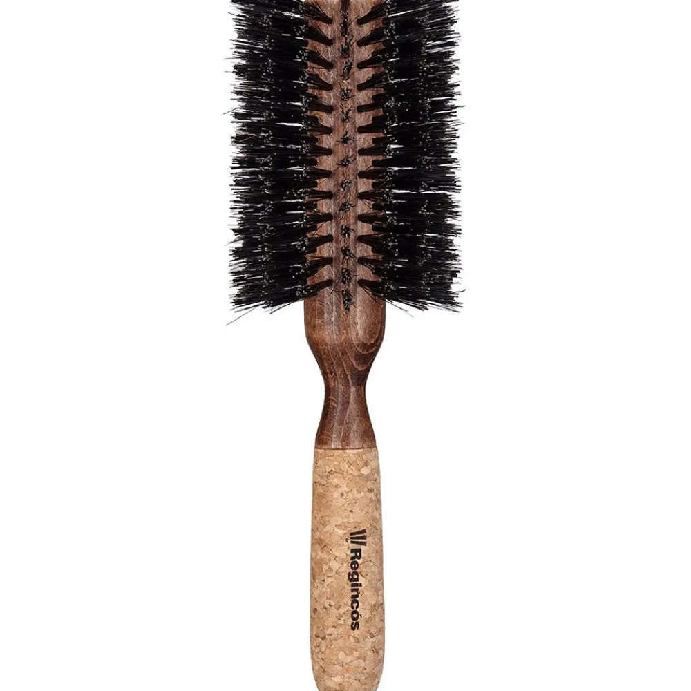 Der Bürstengriff der Regincós Rundbürste 20529, 16-reihig aus Kork liegt besonders angenehm und leicht in der Hand. Die verstärkten Mischborsten (65 % Wildschwein, 35 % Nylon) pflegen das Haar und verleihen gesunden Glanz.