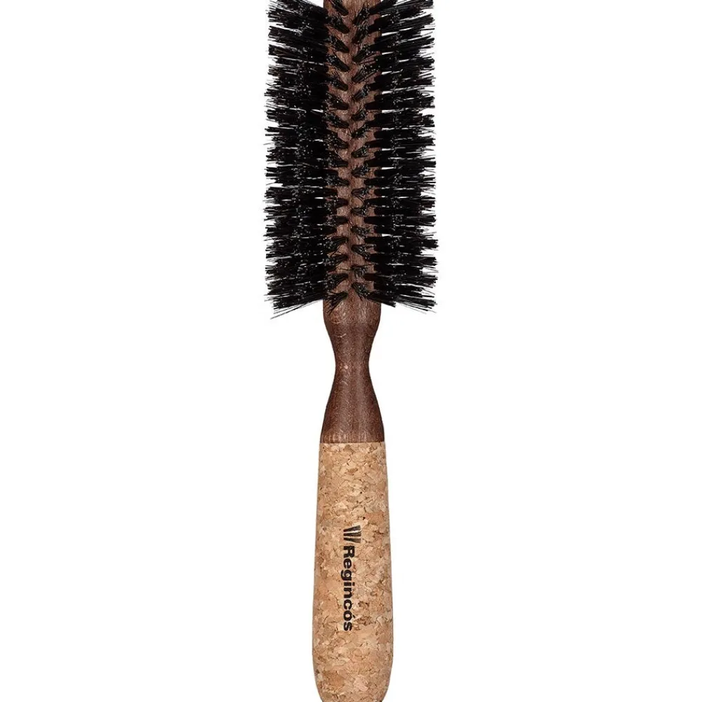 Der Bürstengriff ist aus Kork hergestellt und liegt besonders angenehm leicht in der Hand. Die verstärkten Mischborsten (65 % Wildschwein, 35 % Nylon) der Regincós Rundbürste 17640 MC Large pflegen das Haar und verleihen ihm Glanz.