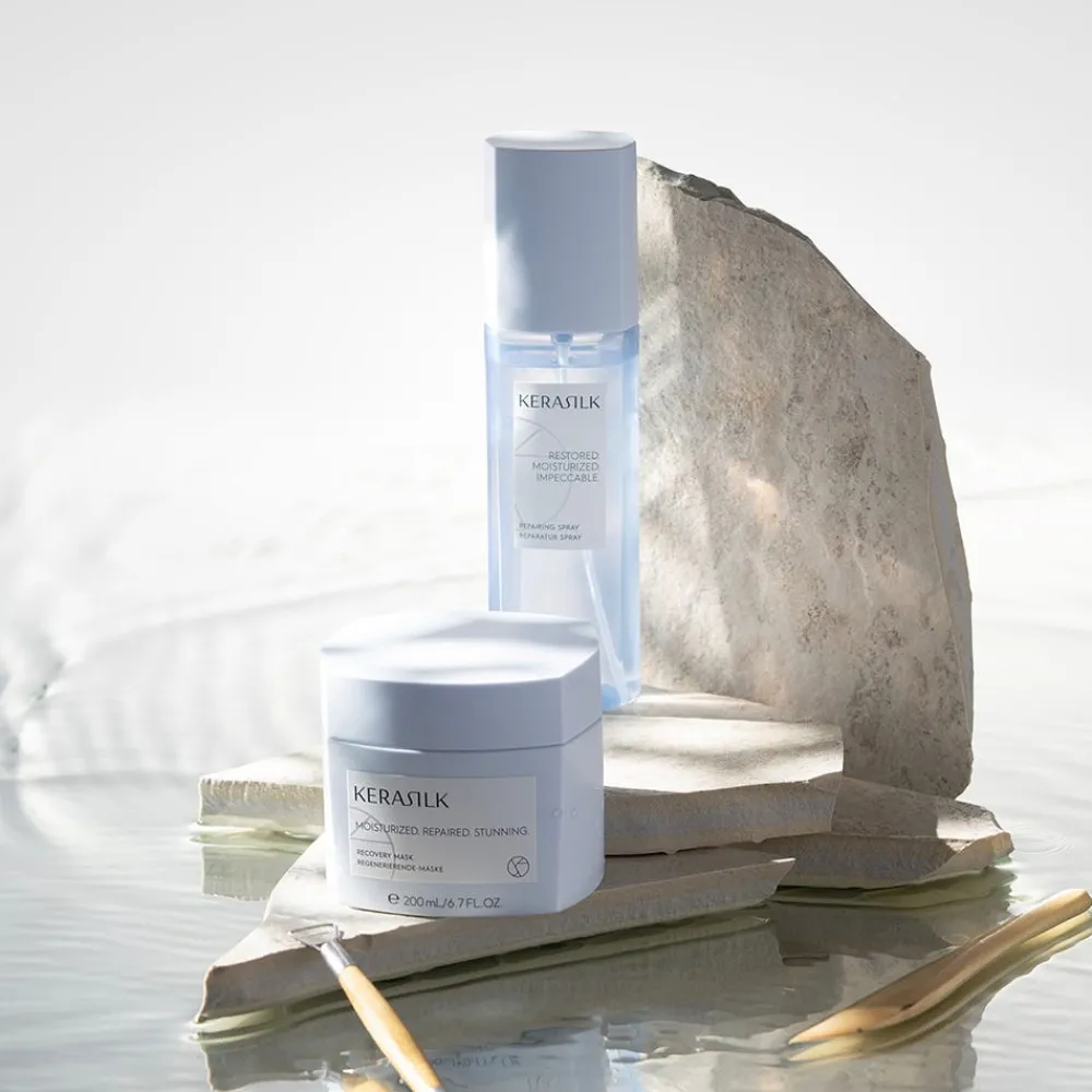 Das Kerasilk Reparatur Spray ist ein leichtes Spray mit Biomimetic SIlk und Hyaloveil. Die zu 100 % vegane Formulierung spendet Feuchtigkeit, pflegt, baut geschädigtes Haar wieder auf und schützt vor Haarbruch – für sofortige Regeneration, Reparatur und ein gesundes, geschmeidiges Haargefühl.