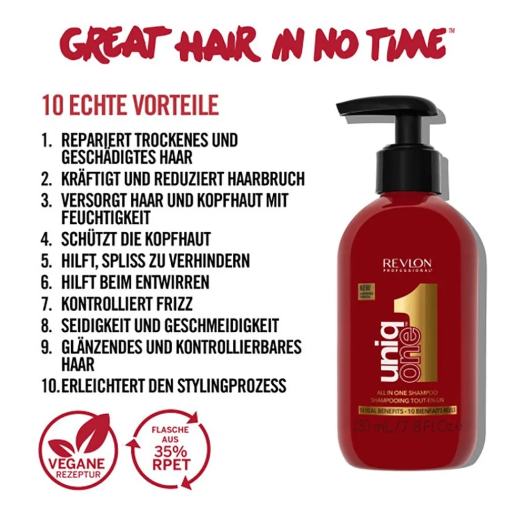 Das Revlon Uniq One Shampoo bringt 10 Vorteile mit und eine neue verbesserte Formel. Entwickelt, um spektakuläre Glätte und Frizz-Kontrolle für seidiges, glänzendes und kämmbares Haar zu bieten.