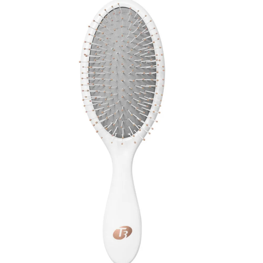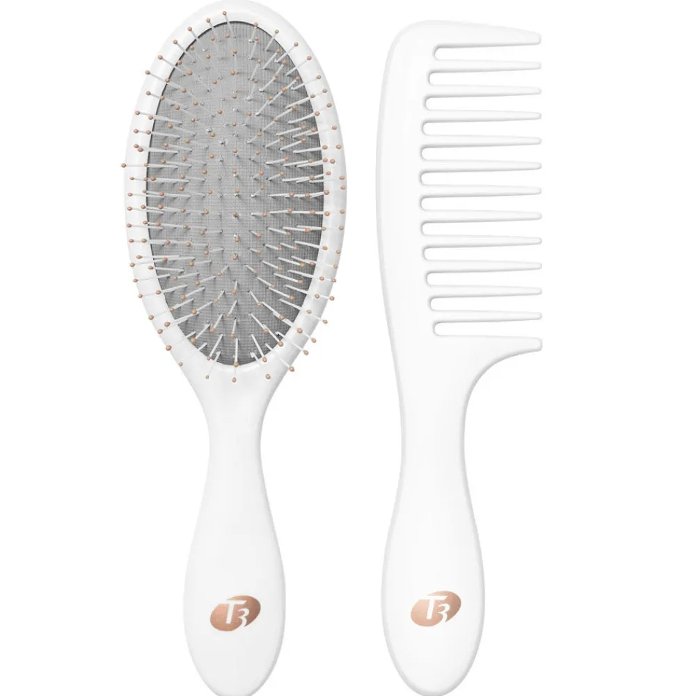 Das T3 Detangle Duo ist das ideale Paar für verheddertes nasses Haar. Zu diesem 2-teiligen Set gehört ein Duschkamm, um dabei zu helfen, flüssige Produkte in der Dusche gleichmäßig zu verteilen, und eine Entwirrungsbürste, die hilft, Knoten im nassen Haar aufzulösen; dabei werden Haarsträhnen entwirrt und sind bereit für das Styling. Die Entwirrungsbürste hat weiche, flexible Borsten, die Knoten leicht auflösen, und zwar mit einer Tastkugel, die die Kopfhaut massiert und stimuliert. Ein Polsterpad passt sich sanft an die Konturen der Kopfhaut an, für eine sanfte Entwirrung des Haars. Der Kamm verfügt über Zähne in gleichem Abstand, um zu helfen, dass flüssige Produkte in jede Strähne von der Wurzel bis zu Spitze gelangen; dabei bleibt das Haar weich und glatt. Sowohl der Kamm als auch die Bürste verfügen über einen tropfenförmigen Griff, für ein bequemes Greifen und eine bessere Kontrolle. Das Entwirrungs-Duo entwirrt jeden Haartyp, einschließlich der Haare mit Extensions und macht es für das Styling bereit.