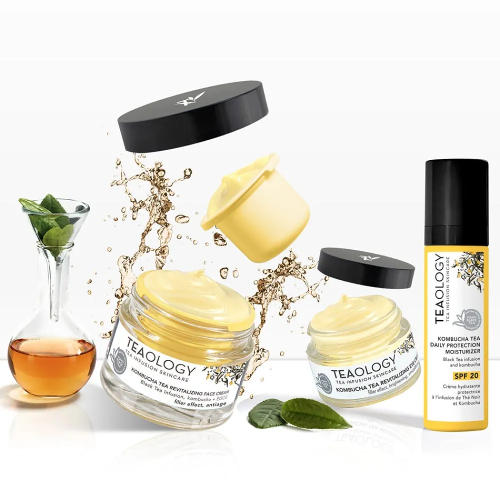 Die Teaology Kombucha Tea Daily Protection Moisturizer SPF 20 Tagespflege mit antioxidativem schwarzem Tee pflegt intensiv und bildet einen mineralischen Schutzschild, der ein breites Spektrum an UVA/UVB-Strahlen und Umweltverschmutzung abdeckt. Der mineralische Filter reflektiert die Strahlen, beugt UV-Schäden vor und wirkt der Entstehung von Falten, dunklen Flecken und Rötungen entgegen. Kombucha, reich an Probiotika und B-Vitaminen, glättet und hellt den Teint auf, während der energetisierende Ingwerextrakt die Spannkraft und Elastizität der Haut verbessert. Dank ihrer leichten Textur, die schnell einzieht und die Haut angenehm mit Feuchtigkeit versorgt, ist sie ein ganzjähriger Hautschutz.
