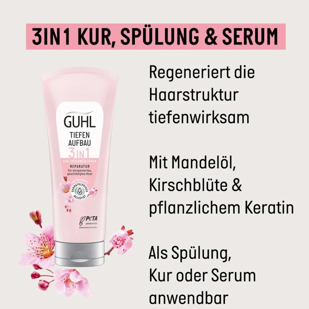 Die Guhl Tiefenaufbau 3 in 1 Kur mit pflegendem Mandelöl, nährender Kirschblüte und pflanzlichem Keratin kräftigt das Haar intensiv, regeneriert die Haarstruktur tiefenwirksam und schützt vor äußeren Einflüssen. Als 3in1 Kur, Spülung & Serum schenkt das Produkt vielseitige Anwendungsmöglichkeiten und gesund glänzendes Haar voller Lebendigkeit. Je nach (Haar-) Bedürfnis kann die Tiefenaufbau 3 in 1 Kur als Kur, Spülung oder Serum angewendet werden.
