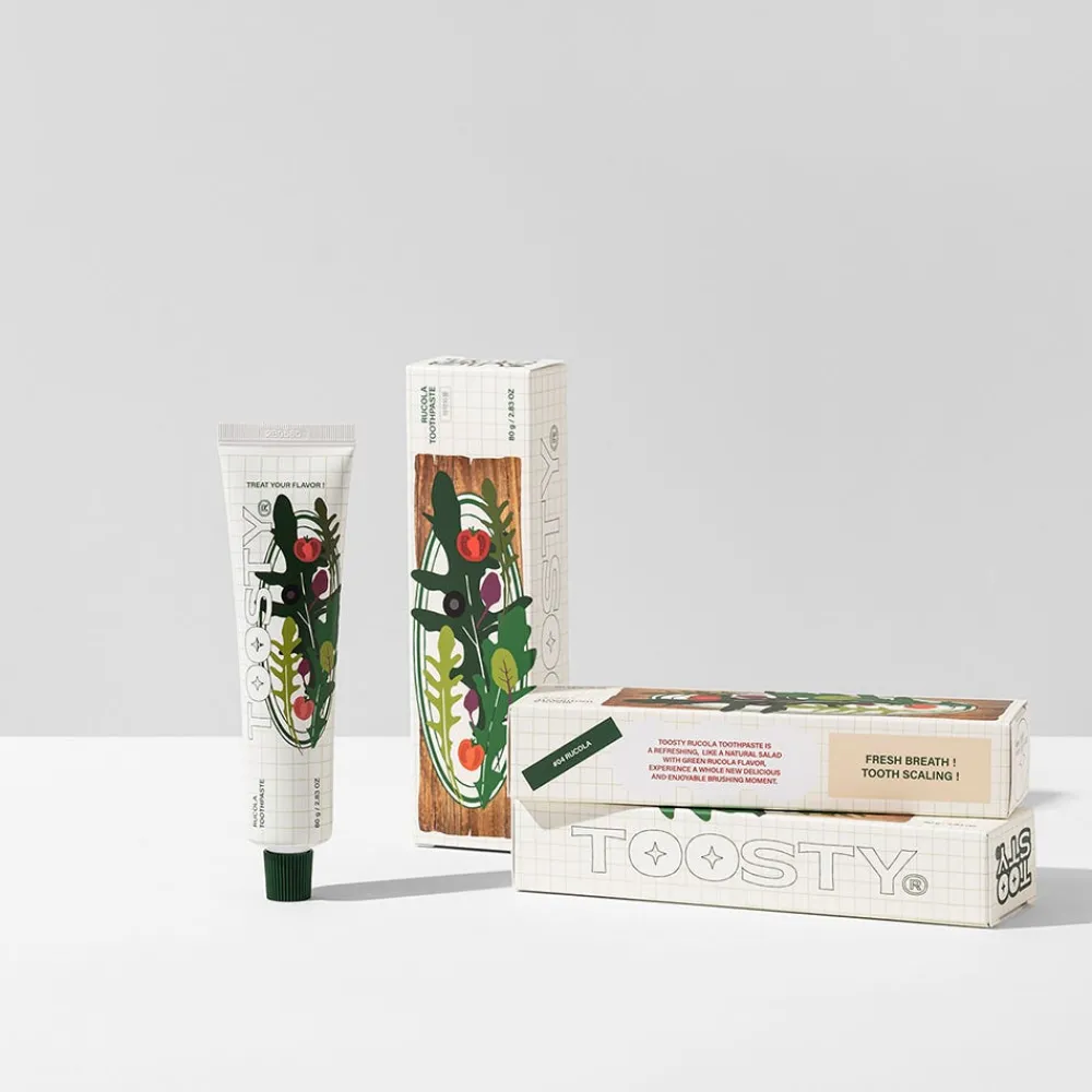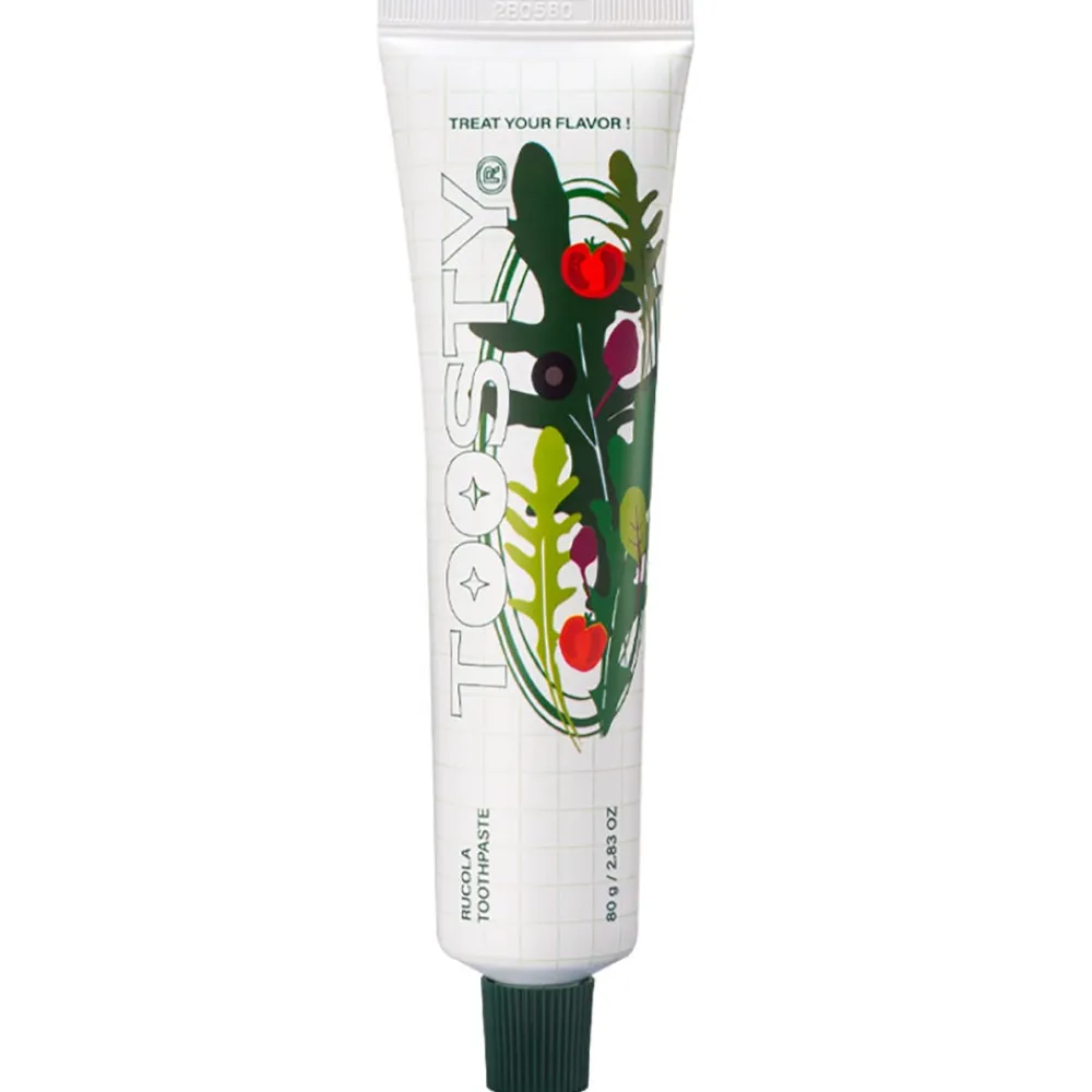 Die TOOSTY Rucola Toothpaste ist eine erfrischende und aufhellende Zahnpasta mit Rucola-Geschmack, die Karies vorbeugt. Diese innovative Zahnpasta mit Rucolageschmack ist ein wahrhaft einzigartiges Zahnputzerlebnis, das eine neue Art von Mundpflegeroutine definiert: eine Explosion von Frische und Sauberkeit wie nie zuvor. Diese Zahnpasta bietet einen unverwechselbaren Geschmack, der die Sinne weckt und ein anhaltendes Gefühl der Frische und Sauberkeit im Mund hinterlässt.Abgesehen von ihrem ausgefallenen und lustigen Geschmack ist diese Zahnpasta vollgepackt mit wichtigen Zahnpflegeeigenschaften. Ihre Formel enthält Anti-Karies-Wirkstoffe, die für ein starkes und gesundes Lächeln sorgen. Darüber hinaus entfernen ihre leicht bleichenden Eigenschaften sanft allfällige Flecken oder Verfärbungen auf der Zahnoberfläche.Diese Premium-Zahnpasta gehört zu einer Reihe von Zahnpflegeprodukten mit anders- und einzigartigen Geschmacksrichtungen.
