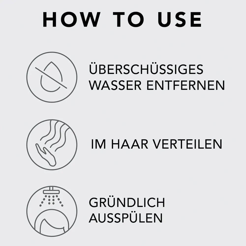Nach der Haarwäsche ins feuchte Haar einmassieren, 3-5 Minuten einwirken lassen und danach gründlich ausspülen.