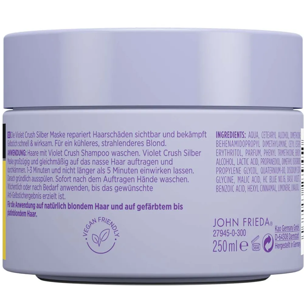 Die John Frieda Violet Crush Silber Maske mit violetten Pigmenten neutralisiert Gelbstich und sorgt so für ein kühleres, strahlendes blond. Die Maske verleiht dem Haar Leuchtkraft, nährt es und repariert Haarschäden. Für die Anwendung auf natürlich blondem Haar und auf gefärbtem bis platinblondem Haar.