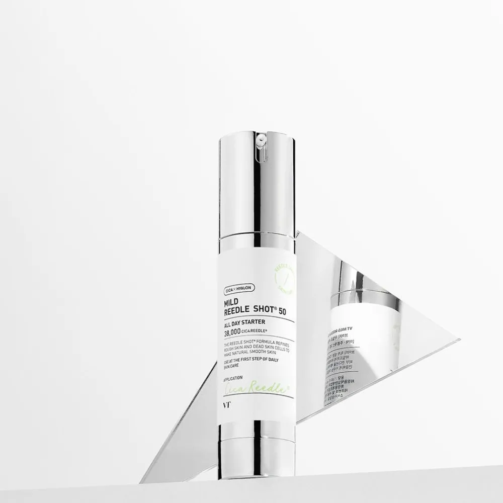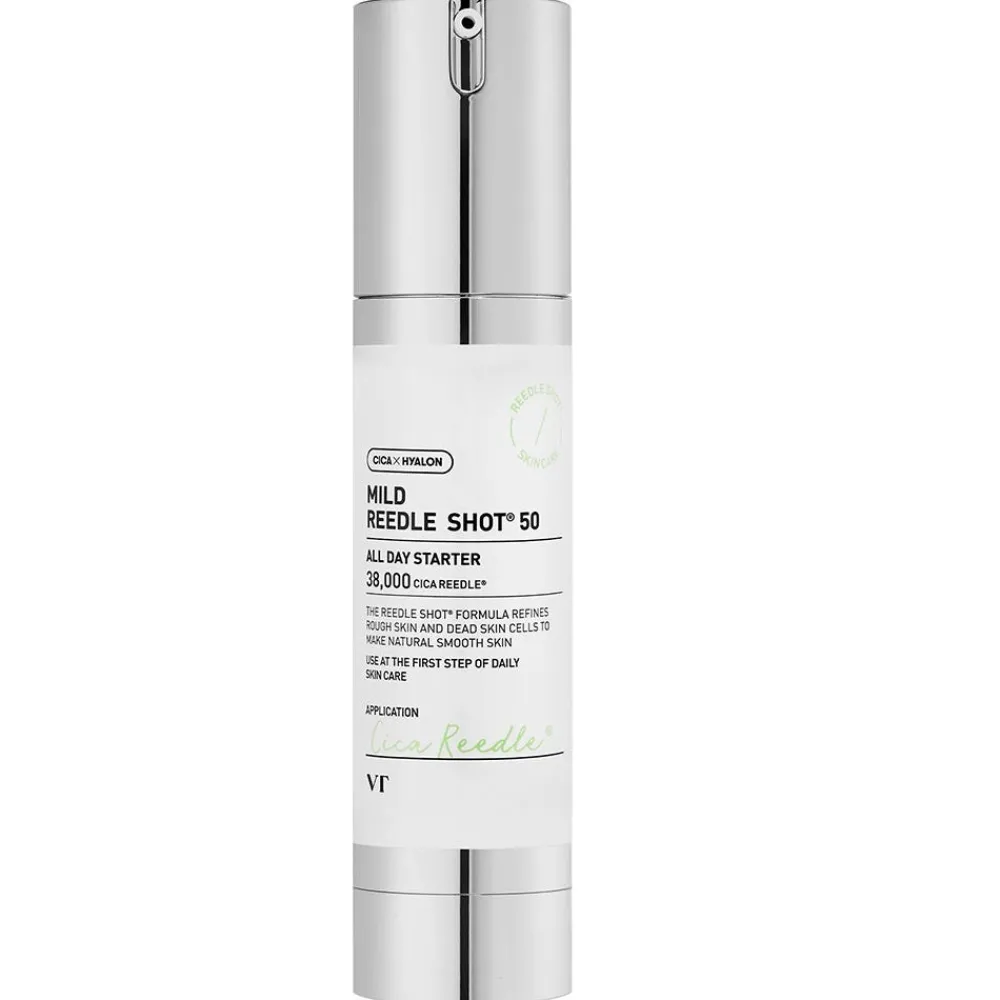 Das VT COSMETICS Mild Reedle Shot 50 ist ein innovatives Gesichtsserum, das die Hauttextur, -festigkeit und -feuchtigkeit sichtbar verbessert. Dank der exklusiven Cica Reedle™-Technologie mit 38.000 Mikronadeln aus Centella Asiatica-Extrakt wird die Aufnahme der Wirkstoffe intensiviert und die Haut von innen heraus erneuert. Das Serum unterstützt die Zellerneuerung, reduziert feine Linien, stärkt die Hautbarriere und verleiht einen gleichmäßigeren, strahlenderen Teint.