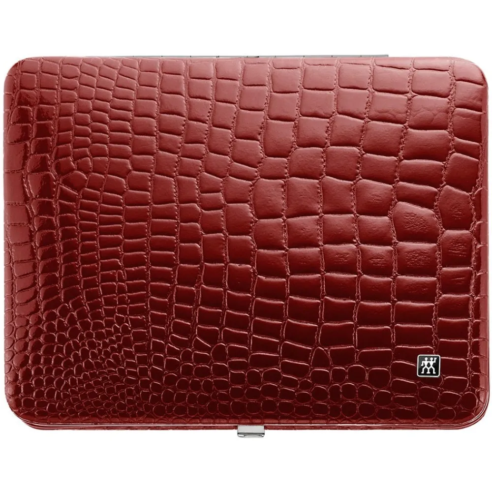 Das Zwilling Classic Maniküre Set 10-teilig in Rot bietet eine praktische Kombination hochwertiger Instrumente zur Pflege der Finger- und Fußnägel. Im Inneren des hochwertigen, schwarzen Rindleder-Etuis im Kroko-Design mit Metallrahmen werden ein Nagelknipser, ein Nagelhautschieber und -reiniger, eine Nagelschere, eine Hautschere, eine Saphir- Nagelfeile, eine schräge Pinzette, eine gerade Pinzette, eine spitze Pinzette, eine Nagelzange sowie eine Hautzange sicher und übersichtlich aufbewahrt. Die Zwilling Beauty Instrumente werden aus rostfreiem, poliertem Edelstahl gefertigt und bieten Funktionalität, Langlebigkeit und Korrosionsbeständigkeit in bewährter Zwilling Qualität.
